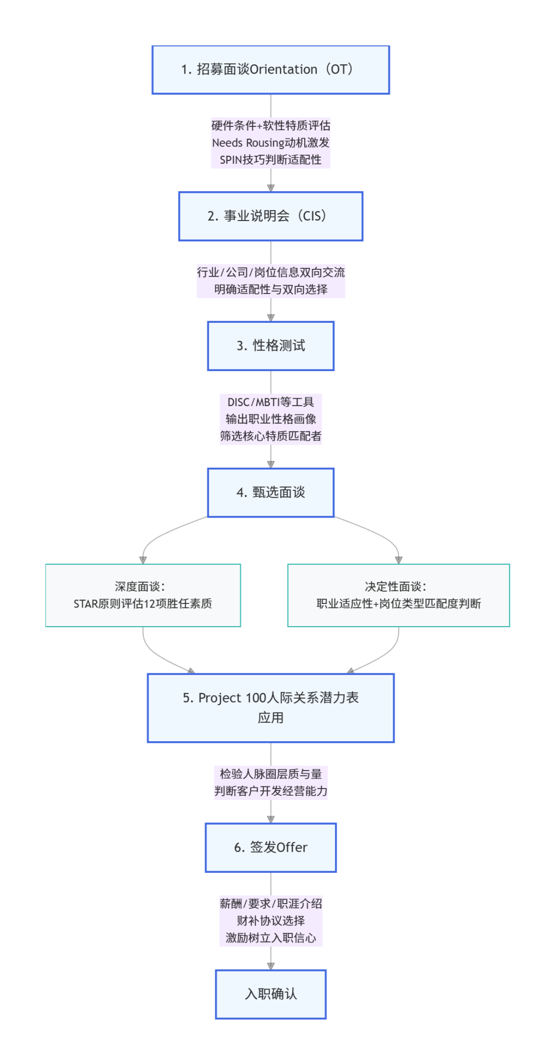 例如最早由一家中美合资保险公司引入并成功实践了20年的顾问营销体系,其中对优秀人才的标准化招募甄选流程共分八个环节: